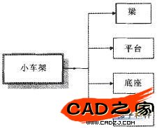 目前模塊化設計方法主要有結構分析法和功能分析法兩種。前者適用于零部件結構特征相對明顯的產品,而后者適用于零部件功能相對獨立的產品,屬于較高的層次。對于小車架這種功能獨立,本身有層次的產品而言,比較適合采用功能分析法對其進行產品模塊族的劃分以及產品功能模塊模型的建立。通過與用戶的多次交流,確定了小車架的模塊劃分原則是:①保持各個模塊在功能和結構方面有一定的獨立性和完整性;②各個模塊間的接口要素便于聯接和分離;③模塊與模塊之間的相關盡量的少;④模塊分解的粒度要適中。