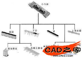 基于以上原則本系統把小車架劃分成了主梁,端梁,平臺,減速機座,卷桶底座,制動器底座,支腿及附屬板等幾個功能模塊其中主梁和端梁作為主要模塊,將決定著小車架的主要形狀和載荷,如圖3所示。