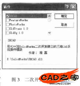 如果在 VC++ 調(diào)試環(huán)境下運(yùn)行 DLL 程序 ,系統(tǒng)會(huì)提示你輸入調(diào)用此 DLL 的可執(zhí)行文件名 ,選擇SolidWorks 可執(zhí)行程序的具體路徑后 SolidWorks 就會(huì)自動(dòng)運(yùn)行 ,使用 SolidWorks 的文件/ 打開(kāi)菜單 ,在文件類型過(guò)濾器中選擇 Add~I(xiàn)ns ( 3 . dll)就可加載自己的 DLL 程序。DLL 注冊(cè)成為 SolidWorks 系統(tǒng)的插件后 ,還可使用工具/ 插件菜單打開(kāi)插件對(duì)話框 ,選中需要加載的插件(如圖 3 所示) ,以后啟動(dòng) SolidWorks 就可自動(dòng)加載該 DLL 程序 ,無(wú)須再進(jìn)行加載操作 ,十分方便。