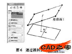 選擇"退出草圖"命令,選擇"參考幾何體",創建基準面命令;選擇通過直線,選擇15Omm直線;選擇角度,輸人傾角30°;選擇上視基準面,建立通過圓斜頂的"基準面1"。如圖6所示。