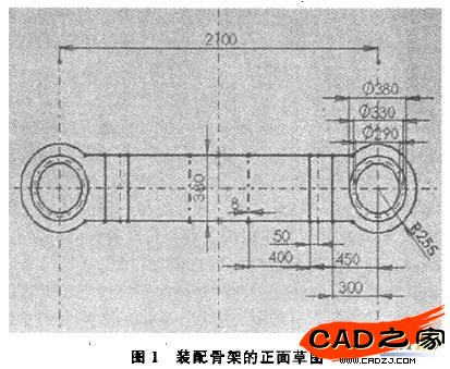 考慮到自頂向下設(shè)計(jì)的特點(diǎn),并結(jié)合具體產(chǎn)品模型的特殊裝配結(jié)構(gòu),所有零件均采用自身的基準(zhǔn)面和設(shè)計(jì)草圖中的要素(點(diǎn)、線、基準(zhǔn)面)進(jìn)行定位,而不用零件自身的特征要素定位,以避免個別零件發(fā)生變更或丟失造成整個裝配體結(jié)構(gòu)解體.首先在裝配環(huán)境下繪制裝配骨架的正面草圖(見圖1)及側(cè)面草圖(見圖2).通過這兩個裝配骨架草圖,確定核心零件的外形尺寸,表示出零件之間的裝配位置、相互關(guān)聯(lián)特性等。在草圖繪制過程中要充分使用約束關(guān)系及尺寸之間的方程式,減少不必要的草圖尺寸,從而使布局草圖簡潔而又能清晰地表達(dá)出裝配零部件的約束關(guān)系、位置關(guān)系、尺寸關(guān)系及結(jié)構(gòu)功能。