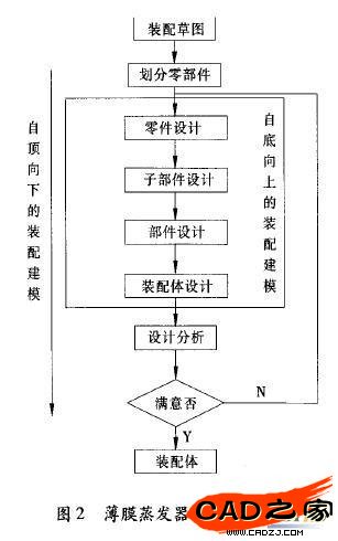 首先對薄膜蒸發器裝配草圖設計,接著將整個裝配體逐級劃分出部件、子部件,一直到最底層的零件;然后進行詳細的零件設計、子部件設計和部件設計;最后,進行裝配體設計,完成產品最終裝配模型。在此基礎上通過修改裝配尺寸和零件尺寸對裝配圖進行參數化設計,對設計結果進行分析,判斷是否符合要求,井反饋到裝配設計和零部件設計。如此循環,直到裝配體達到設計要求為止。