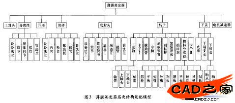 針對薄膜蒸發器零件多,裝配復雜的特點,采用自頂向上為主、自底向上為輔的裝配建模方法薄膜蒸發器裝配體的裝配進行設計,見圖2。