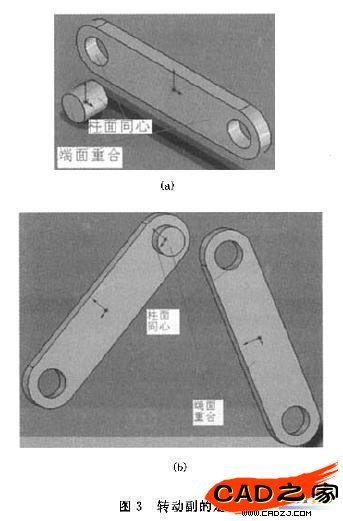 SolidWorks中的配合是基于特征的,而機構中各構件是通過運動副連接的,因此,裝配時構件之間的配合特征要體現出運動副的類塑特性.圖3說明了轉動副的定義過程.