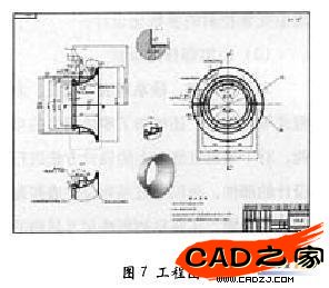 (7)自動生成的工程圖,因為三維CAD的全相關性,調人的工程圖(見圖7)中相應的尺寸已經作了相應的修改(包括明細表以及工程圖中的各種屬性),只需將尺寸和注釋等移到合適的位置即可。