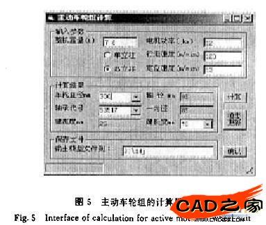 在設計中涉及到大量的數學計算、經驗、歷史數據的查詢,起重行業標準文獻的引用,標準結構和可參數化結構圖塊及原有圖形資源共享等工作.為避免繁瑣的重復計算與查表,本項目根據用戶定單要求的設計參數(貨物重量P,貨物長度L,寬度W,高度H,提升速度v1,運行速度vx,貨叉伸縮速度vc,最大提升高度Hmax)采用Visual Basic建立了用戶設計的計算模塊,可以完成對堆垛機典型零部件的設計計算(如.:車輪、軸、軸承和鍵、鏈等的計算),如圖5所示。
