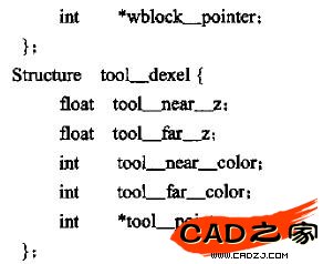 數據模型可以用光線投射法求得。因為當物體以邊界表示描述時,光線投射方法通常用來實現構造實體幾何操作,令投影平面與顯示平面一致,從每一個像素位置發射一根射線穿過物體,然后沿每根射線路徑定出表面相交部分,保存深度值。工件和刀具的數據結構為: