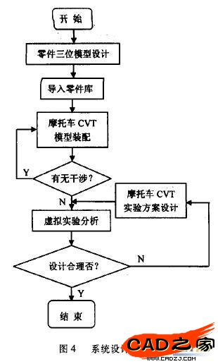 實驗開始前,按照以上步驟設計出實驗方案,給定其輸人輸出函數,對摩托車CVT進行運動仿真,靜、動力學分析,并將仿真分析結果存儲在數據庫,以便同理論數據比較。如果根據所設計的方案無法達到設計的要求,就必須更改設計方案,如果是機構的力學性能不符要求,可對機械模型進行修改,加約束、加強結構剛性等。