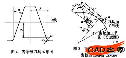 用齒條形刀具加工齒輪,相當于齒條齒輪的無間隙嚙合運動,以齒條形刀具為例,刀具齒廓的頂部有兩個圓角,Cp是圓角的圓心,rp是圓角半徑。
