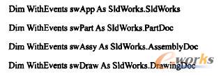 SwAddin對象允許我們建立SolidWorks插件。在VB6建好的工程文件中點選"工程"菜單,"引用"菜單項,分別選中"SolidWorks 2006 exposed type type libraries for add-in use"、"SolidWorks 2006 Type Library"、"SolidWorks 2006 Constant type Library"、"Microsoft DAO 3.6 Object Library";在聲明處插入如下語句: