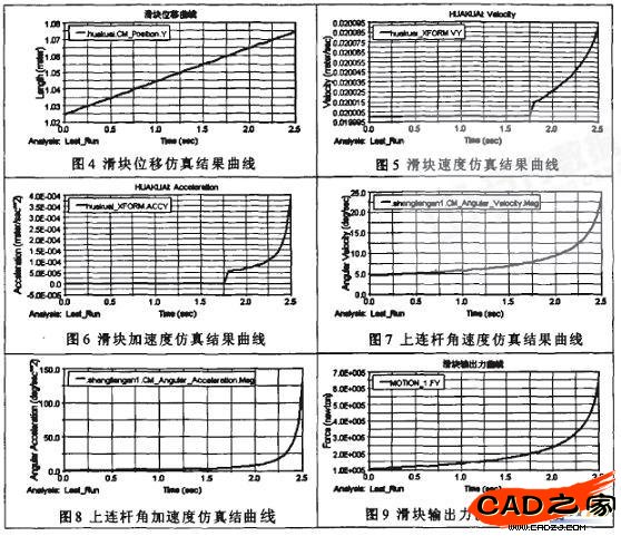 滑塊的運動精度直接影響折剪機床的工作性能,虛擬樣機模型中,滑塊相對機架沿Y軸方向的移動是折剪機床工作的主運動,其運動性能反映了折剪機床的總體性能。因此,對折剪機床在各種工況下的運動和動力進行仿真,獲取滑塊的位移、速度和加速度的動態變化曲線及滑塊的輸出力,實現產品的優化設計。采用ADAMS/View提供的函數F(time,…)=SIGN(98000,-VX(zjjc.huosai.MARKER_147)定義施加在活塞桿上的推力。給定總的仿真時間2s,仿真步長200,進行仿真,然后用后處理顯示得到滑塊等主要構件的位移、速度和加速度曲線,見圖4~圖9。