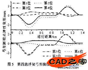 圖5是第四(尾部)懸浮架上8個弓形腳鉸點的垂向彈性變形曲線。由圖5可見,第2、4位和第5、7位鉸點的彈性變形較大,最大變形量為一2.51mm(負號表示方向向上),同一時刻上述四個鉸點的變形方向相同,但各點的變形方向在前、后緩平u曲線段剛好相反。第1、3位和第6、8位鉸點的彈性變形相對較小,小于0.8mm,變形方向分別與其對應的第2、4位和第5、7位相反。
