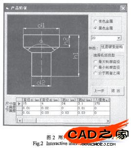 下面以一端粗大的軸類件為例,介紹以VB為開發平臺,利用SolidWorks建立此類件的工藝分析的常用方法。如圖1所示。該類型是典型的正擠壓件,成形方案如表1所示。首先將零件的尺寸數據輸入數據庫,然后根據材料種類調用材料庫,按照毛坯直徑選擇成形方案.利用VB通過調用SolidWorks的API函數繪制零件的模型。再調用零件尺寸數據對模型進行參數化驅動并顯示零件質量特性。根據體積不變原則.可以求出毛坯尺寸特征.再通過工藝規則判斷如果滿意就填寫工藝過程卡片,否則,改變工藝方案或改變零件尺寸參數。程序的運行交互界面如圖2所示。圖3為程序流程圖。