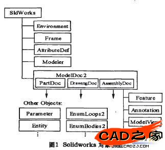(1)SolidWorks API應用程序接口,是基于ActiveXAutomation的編程接口,凡支持COM編程的開發工具均可對其進行二次開發。COM不僅定義了組件程序之間進行交互的標準,而且也提供了組件程序運行所需的環境。對象鏈接與嵌入OLE技術是COM技術的應用,它使應用程序之間能通過數據嵌入或鏈接的方式共享數據。SolidWorks支持COM技術標準,同時也支持OLE技術。作為一個COM/OLE服務器,SolidWorks提供了大量的API/COM OLE對象以及這些對象所擁有的方法和屬性,涵蓋了全部的SolidWorks的數據模型,用戶通過在客戶應用程序中對這些API對象及其方法和屬性的操作,可以實現SolidWorks的功能定制與擴展,滿足用戶的專業要求。