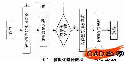 參數(shù)化設(shè)計是指參數(shù)化的尺寸不需用確定的數(shù)值表示,改變一個參數(shù)值將自動改變所有與它相關(guān)的尺寸,通過調(diào)整參數(shù)來修改和控制幾何形狀,自動實現(xiàn)產(chǎn)品的三維造型。參數(shù)化設(shè)計模型的形成過程見圖1。首先對實際要解決的問題進行分析,根據(jù)實際問題確定關(guān)鍵的約束參數(shù),這些約束參數(shù)必須能夠唯一地確定一個造型;然后輸入約束參數(shù),并對參數(shù)進行有效性判定,并據(jù)此判定決定是否修改參數(shù);最后,觀察繪制的模型是否符合要求,如果符合則保存設(shè)計好的產(chǎn)品造型,否則進行參數(shù)的修改,重新進行繪制和判定。