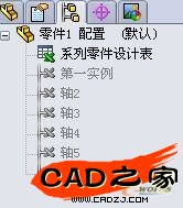 在成功輸入基本零件各尺寸后,接著就要輸入其它各相似軸的尺寸參數,以第一實例輸入的格式,各參數對號入座。完成并保存后零件配置欄出現系列零件圖標。如下圖所示