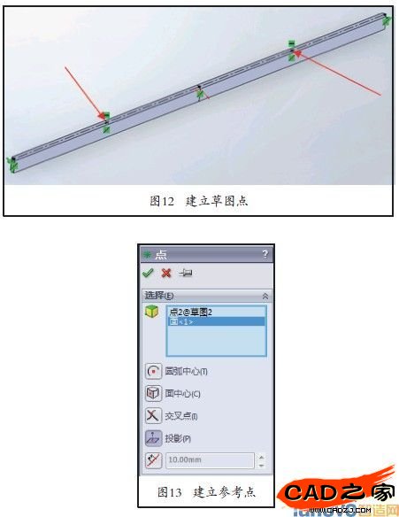 7)為了指定載荷,我們需在兩個實體面的中點建立草圖點,如圖12所示。然后用參考幾何體命令建立參考點,如圖13 所設置。