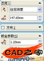 18 方向1群組的深度值設為147.6mm,確認鈑金參數群組的厚度值設為1.2mm之后一邊確認預覽,一邊把反向復選框設為ON/OFF讓板厚的斷面圖向內。折彎半徑值設為1.2mm。