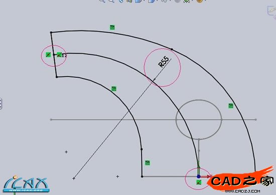 10以右視圖為基準面。畫直線,選擇圓形邊線。建立中點,和垂直約束關系,