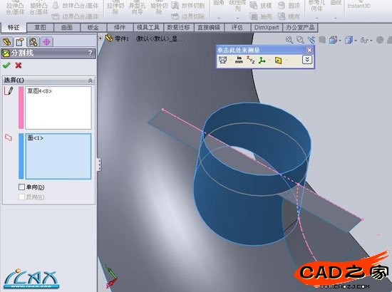 13選右視基準面,和兩圓相交處,建立分割線(這步萬不可省略,將導致以后抽殼的厚度