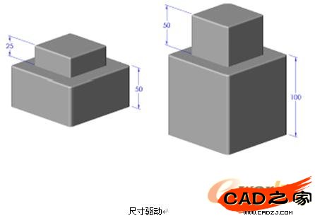 你可以給定各部分之間的尺寸和幾何關系。在你保存圖的時候,改變尺寸就會改變零件的大小和形狀。例如,在下圖中,上部總是底部的一半高。