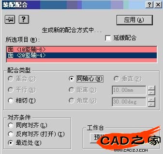 7 對配合方式滿意時請單擊應用。當您關(guān)閉裝配配合對話框時,所有延遲的配合條件都被求解,零部件會移至指定的位置,并且此配合會被添加適當?shù)呐浜辖M中。