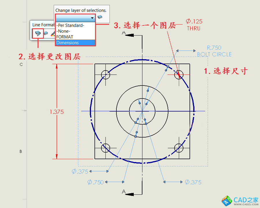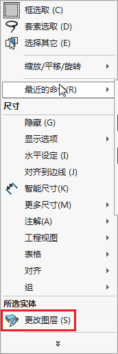 然后選擇要添加到圖層的尺寸或者注釋,并選擇更改圖層按鈕,并從選擇框中選擇一個圖層。 然后,尺寸將更改為圖層的應用顏色。