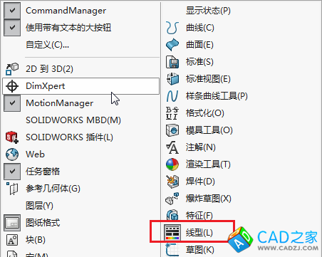 我們可以使用【線型】來更改尺寸顏色。 要啟用啟用線型工具欄,首先鼠標右鍵單擊CommandManager欄,然后從快捷菜單中選擇線型。