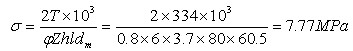 ,其中T=334Nm,Z=6(花鍵的齒數(shù)),h=3.7(花健齒側(cè)面的工作高度)L=80(花鍵工作面長度),dm=60.5(花鍵的平均直徑)通過計算,求得在此力作用下,花鍵產(chǎn)生的最大擠壓應(yīng)力為7.77MPa.