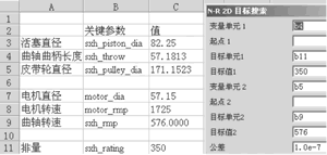 根據“皮帶輪直徑×曲軸轉速=電機帶輪直徑×電機轉速”以及排量計算公式,滿足條件在曲軸轉速為576rpm的情況下泵排量達到350升/分鐘,采用目標搜索的Newton Raphson 2D方法來求解皮帶輪直徑和曲軸軸柄長度,如圖8所示。