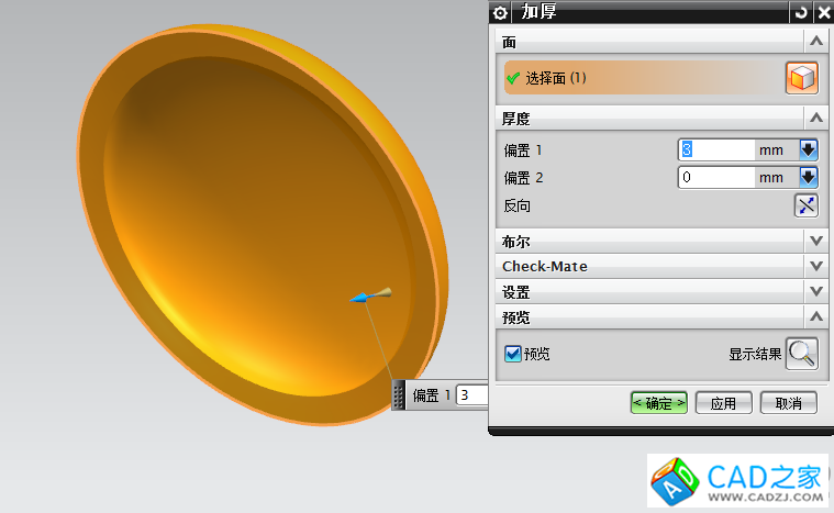 此時只需要用一個加厚命令就可以將想要的片體輕松變成實體了,這里需要注意的是,加厚的厚度大于曲面的曲率半徑時會報錯,所以加厚命令也可以間接的驗證曲面光順的好與壞。