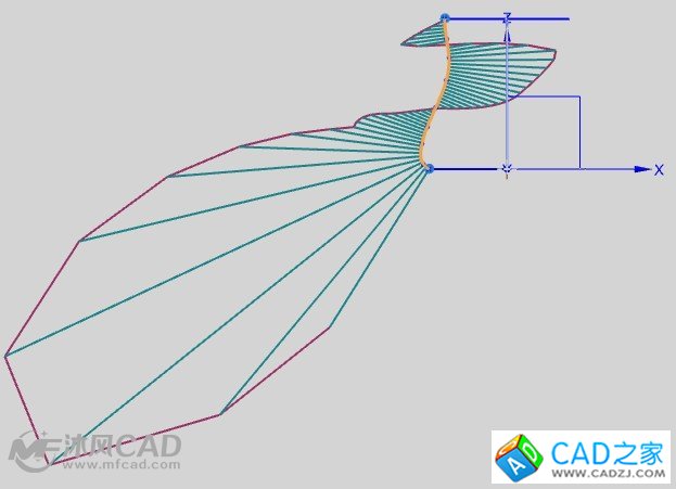八、然后以同樣的方法創(chuàng)建XOZ平面上的樣條曲線,同樣調(diào)節(jié)曲率梳,如圖所示。