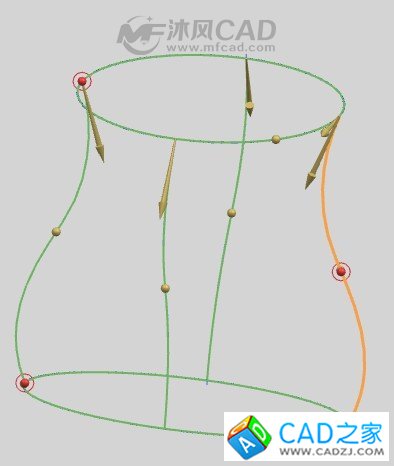 十、然后使用【通過曲線網(wǎng)格】命令,選擇上下兩個橢圓為主曲線,在使用通過曲線網(wǎng)格命令的時候主曲線與交叉曲線分別必須是同方向與起點(diǎn)皆相同,如圖所示兩個主曲線的起點(diǎn)是不相同的。