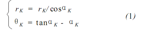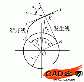 當(dāng)直線發(fā)生域沿一個圓的圓周作純滾動時 ,直線上任意一點 K的軌跡AK稱為該圓的漸開線,簡稱漸開線。點 A 為漸開線在基圓上的起點, K為漸開線上任意一點,其向徑用 r K表示,漸開線 A K 段的展角用θK 表示,基圓半徑為r K。法線 B K與點 K速度方向線之間所夾得銳角稱為齒廓在該點壓力角,記為αK。 根據(jù)漸開線的性質(zhì) ,得到漸開線的極坐標(biāo)參數(shù)方程式為: