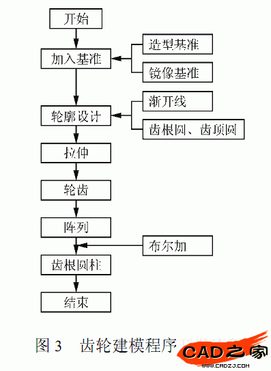 根據(jù)齒輪造型原理和對特征參數(shù)的提取 ,本文通過二次開發(fā)工具 GRIP完成齒輪的參數(shù)化建模 ,開發(fā)流程如圖 3 所示。