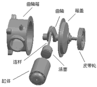 本例的設計對象是一真空泵,其工作原理是通過一個連接在皮帶輪傳動系統中的曲軸帶動活塞進行往復運動,從而排出缸體腔內的空氣,達到消磁和干燥的目的,如圖1所示。
