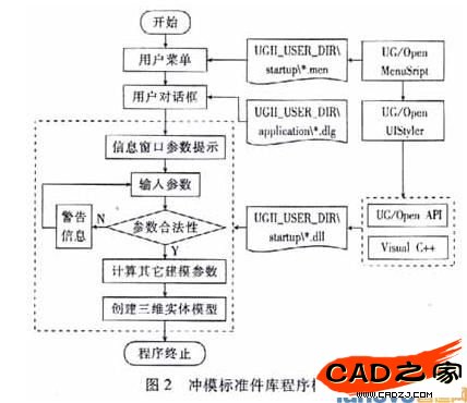 標(biāo)準(zhǔn)件庫(kù)的建立綜合運(yùn)用了上述UG/OpenMenuSript、UG/Open UG/Open UIStyler、UG/Open API他Visual C++6.0等UG二次開(kāi)發(fā)關(guān)鍵技術(shù).其程序框如圖2所示。其中,利用UG/Open MenuSeript編寫用戶菜單,直接掛在UG系統(tǒng)的主菜單上,形成與UG融合統(tǒng)個(gè)的界面;利用UG/Opea UISlyler制作UG風(fēng)格的對(duì)話框,供用戶萊單調(diào)用;通過(guò)Visual C++和UG/Open APl編寫參數(shù)化設(shè)計(jì)應(yīng)用程序,并生成動(dòng)態(tài)鏈接庫(kù)(Dynamic Link Library)文件,在UG啟動(dòng)時(shí)自動(dòng)加載,實(shí)現(xiàn)了對(duì)UG的底層開(kāi)發(fā)。
