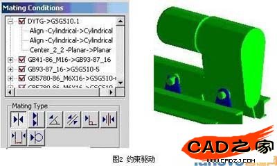 約束驅(qū)動(dòng)技術(shù)主要用于定義標(biāo)準(zhǔn)件、通用件或通用部件在產(chǎn)品中的位置關(guān)系。例如格柵部件中的電液推桿與底座間之間的位置關(guān)系可以通過(guò)兩個(gè)對(duì)齊約束和一個(gè)對(duì)心約束來(lái)控制,如圖2所示。約束類型包括:配合、對(duì)齊、角度、平行、垂直、相切、對(duì)心、距離等。