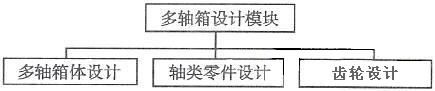 多軸箱的設計首先要采用基于裝配的特征建模法建立多軸箱的裝配模型,然后在這個模型中對零部件展開設計,多軸箱的設計主要包括多軸箱體的設計和傳動系統的設計,而傳動系統是由若干主軸、傳動軸和齒輪組成的。根據多軸箱的裝配層次,將多軸箱設計模塊分為3個子模塊,如圖1所示。多軸箱設計模塊在多軸箱總體裝配模型的平臺上,通過交互界面接受用戶輸入的設計數據。