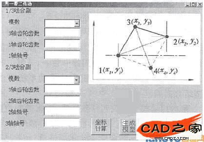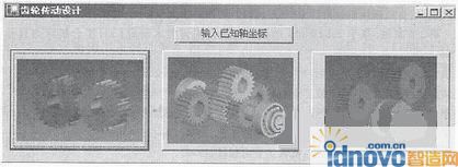 基本傳動模型模塊包括圖形庫、數據庫和主控程序三部分。圖形庫包括全參數化的齒輪模型,數據庫中存放所有傳動軸和主軸的坐標,以便計算時調入,主控程序完成坐標計算、數據訪問以及模型更新等操作。在進行組合機床設計系統時,首先為每根傳動軸和主軸編號,并且將已知軸坐標存放在數據庫中;然后選擇需要的基本傳動模型,經過計算得出未知軸坐標并存放于數據庫,最后建立模型。