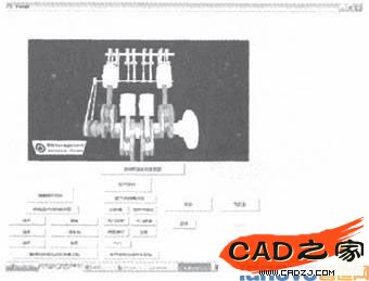 在用戶化界面中,使用者只需在確定安裝目錄與程序一致的前提下,打開Forml文件,便會呈現圖5所示的界面,這時用戶只需點擊界面中任何一個按鈕,便可以從上面的窗口中看到所要查看的對象,其中包括發動機各零/部件及其裝配圖,也可以清晰地看到曲柄連桿機構和配氣機構工作原理。